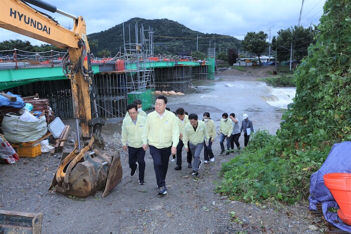 | ▲화순군이 6일 제11호 태풍 ‘힌남노’ 피해 상황을 점검하고 신속 복구에 나섰다. 구복규 화순군수와 군 관계자들이 화순읍 삼천교 교량 공사 현장을 방문, 피해 상황을 점검하는 모습(사진=화순군) |