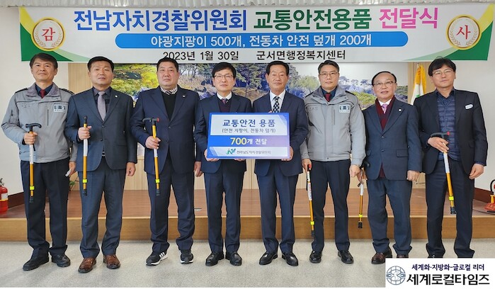 [세계로컬타임즈 김명진 기자] 전라남도자치경찰위원회는 30일 지난해 어르신 교통사고 사망자가 가장 많이 발생한 영암을 방문해 어르신 교통사고 예방을 위한 야광 지팡이 등 교통안전 용품을 전달했다.