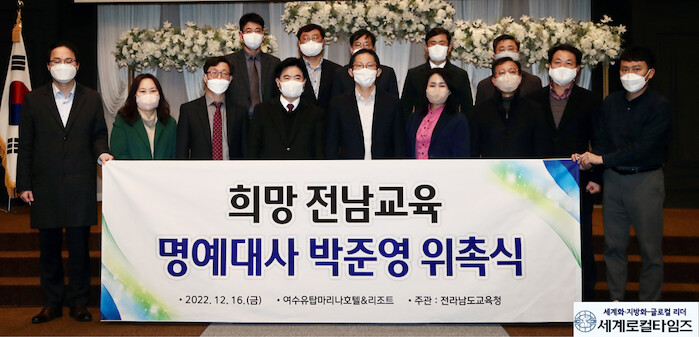 16일 전남교육청에 따르면 이날 여수 유탑마리나호텔&리조트에서 ‘희망 전남교육 명예대사’ 위촉식을 갖고 박준영 변호사를 명예대사로 위촉했다.