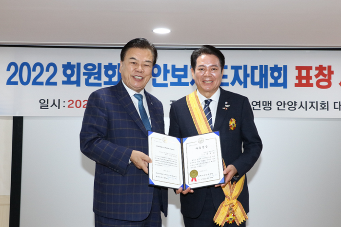 5일 안양시에 따르면 지난 2일 동안구 자유센터에서 개최된 한국자유총연맹 안양시지회 회원화합 안보지도자대회에서 최창환 경기도지부 회장이 세계자유민주연맹 야오잉치 회장을 대신해 최 시장에게 자유장을 전달했다.