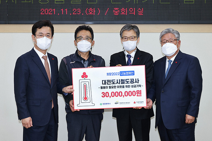 사업비는 온통대전 ‘온정나눔’기부 플랫폼 기부금과 후원단체의 사회복지공동모금회 지정기탁금으로 운영할 계획이다. 시는 이번 사업 성과에 따라 예산 투입 등 사업 확대 여부를 검토한다는 방침이다. 이날 협약식에서는 대전도시철도공사 임직원들이 십시일반으로 모금한 3천만 원을 온정나눔에 기부하는 기탁식도 함께 진행됐다.