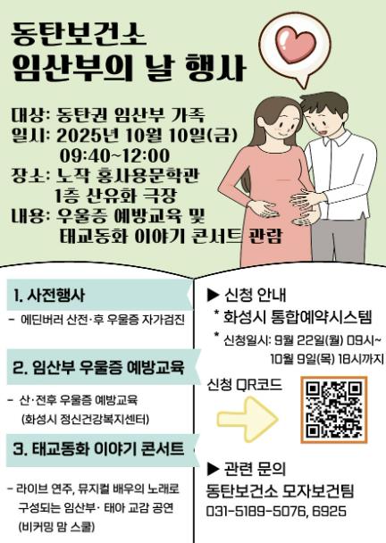 기념행사에서는 동탄권역 예비 부모 35쌍(70명)을 대상으로, ▲산전·후 우울증 예방 특강(화성시정신건강복지센터) ▲태교 동화 이야기 콘서트 등 임산부를 위한 프로그램이 운영된다.