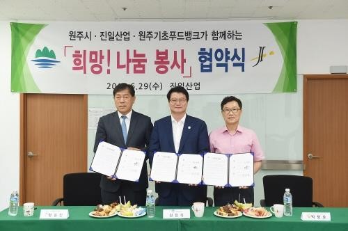 [세계로컬신문 온라인뉴스팀] 강원도 원주시는 29일 오후 2시 (주)진일산업(대표 황응진)과 원주기초푸드뱅크와 함께 진일산업 강원테크니컬센터에서 '나눔 봉사' 업무협약을 체결했다.