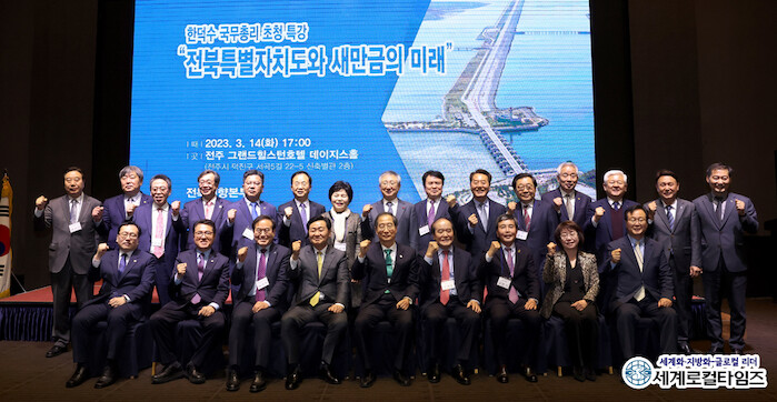 [세계로컬타임즈 조주연 기자] 14일 오후 전북 전주 그랜드힐스턴 호텔에서 ‘전북특별자치도와 새만금의 미래’ 란 주제로 열린 전북애향본부 한덕수 국무총라 초청강연에 김관영 전북도지사를 비롯한 윤석정 전북애향운동본부 총재, 전북도내 기관장, 대학교 총장, 애향본부 임직원 등 150여명이 참석한 가운데 특강을 마치고 기념촬영을 하고 있다.