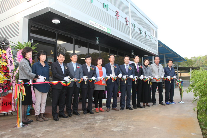 | ▲ 경북 구미시 선산읍 생곡리에 위치한 농업법인회사 (주)구미곤충산업연구농장에서 열린 준공식에 참석한 권순식 대표와 남유진 구미시장, 이양호 전 농촌진흥청장 등 내빈이 축하 테이프를 자르고 있다. |