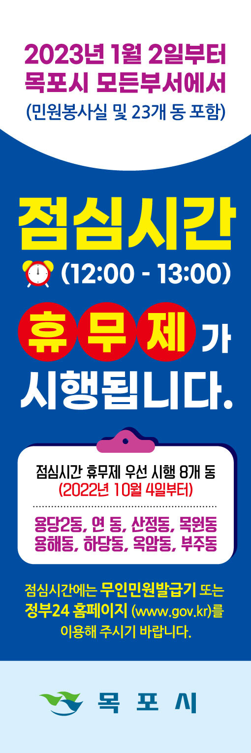 중식시간 휴무제 운영시간은 12시부터 오후 1시까지이며, 목포시청과 사업소 및 23개 행정복지센터를 포함한 모든 부서에서 시행될 예정이다.