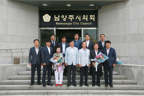 | ▲25일 박유희 남양주시의회 의장(앞줄 중앙)이 시의회 앞에서 기념 사진을 촬영하고 있다<사진=남양주시의회> |