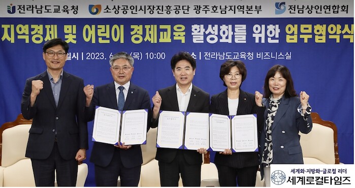 [세계로컬타임즈 김명진 기자] 전라남도교육청이 15일 청사 내 비즈니스실에서 소상공인시장진흥공단광주호남지역본부, 전남상인연합회와 지역경제 및 어린이 경제교육 활성화를 위한 업무협약을 체결했다.