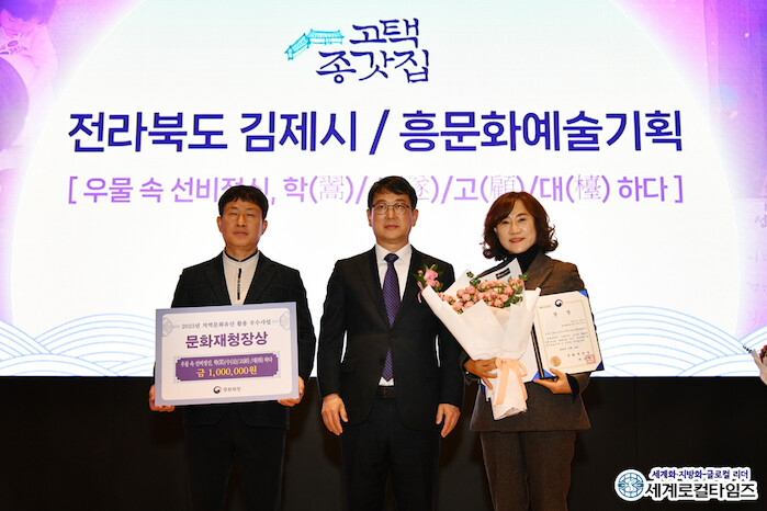 16일 문화재청과 김제시에 따르면 지난 14일 DCC대전컨벤션센터에서 개최된 ‘2023 지역문화유산 활용 우수사업’ 시상식에서 김제시의 ‘우물 속 선비정신, 학(學)/수(隨)/고(鼓)/대(帶)하다’가 ‘고택·종갓집 활용’ 부문 우수사업으로 선정됐다.