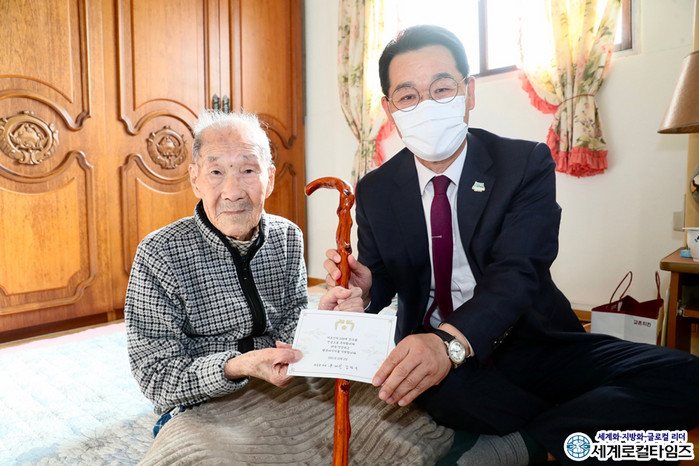[세계로컬타임즈 조주연 기자] 권익현 전북 부안군수가 20일, 올해 100세를 맞이한 장수어르신 가정을 방문해 장수지팡이 ‘청려장’을 전달했다.