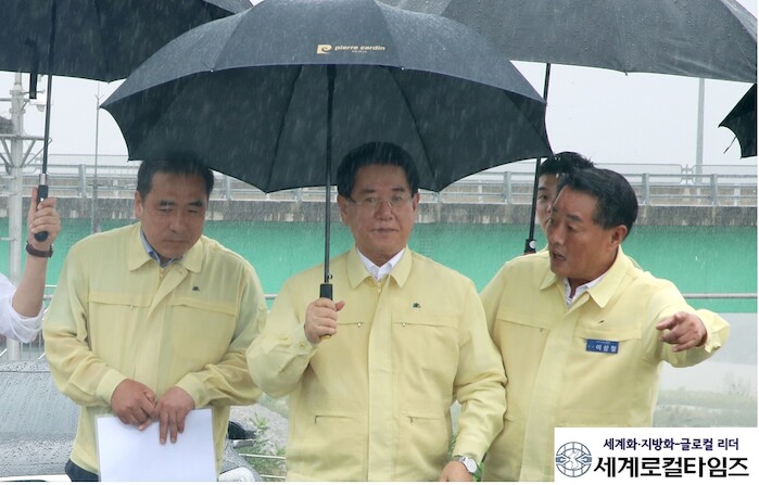 김영록 지사는 현장에서 2020년 집중호우로 유실된 제방을 살피고 “제방 유실로 피해가 큰 주민에게 심심한 위로의 말씀을 드린다”며 “같은 일이 발생하지 않도록 예찰활동·전직원 비상근무 등 선제적 대응을 바란다”고 말했다.