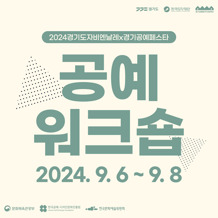 공예워크숍은 작가 작품시연 프로그램으로 9월 6일 개막하는 국제 도자예술 행사 ‘2024경기도자비엔날레’와 경기도 대표 공예문화 축제 ‘2024경기공예페스타’와 연계해 진행된다.