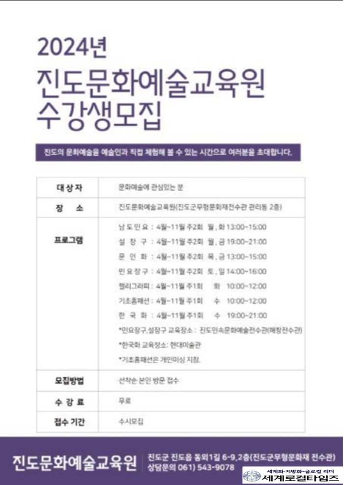 [세계로컬타임즈 문형원 기자] 진도문화예술교육원이 수강생을 모집한다.