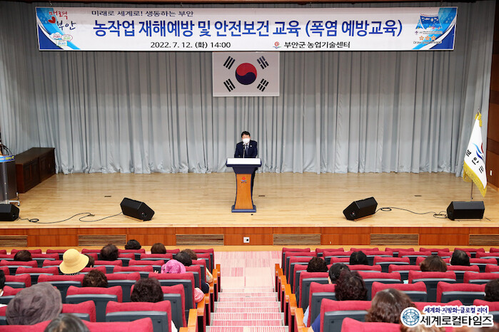 [세계로컬타임즈 조주연 기자] 전북 부안군이 농업인을 대상으로 12일 폭염 대비 안전교육을 실시했다.