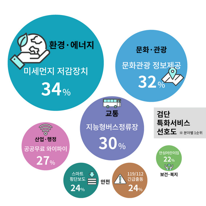 그 결과 주민들은 미세먼지(36%), 의료시설부족(33%), 심야시간범죄(30%) 등이 개선이 필요한 사항으로 손꼽았으며, 미세먼지 저감장치(34%), 문화·관광정보 제공(32%), 지능형버스정류장(30%) 등의 특화서비스를 선호하는 것으로 나타났다.