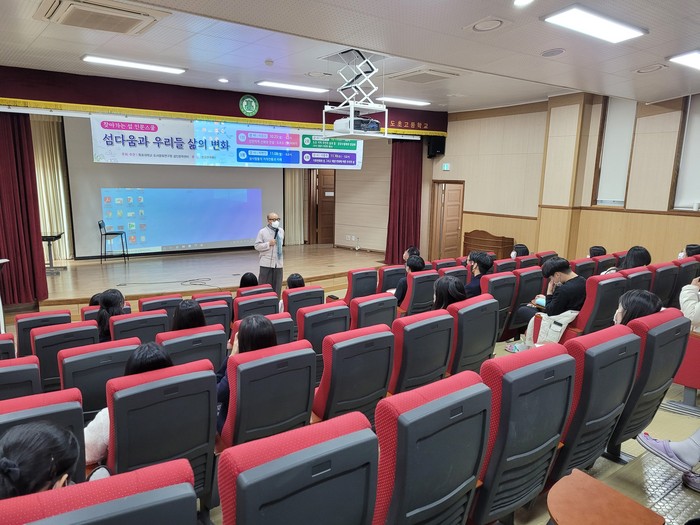 1학년 학생들을 대상으로 실시한 강의는 ‘섬다움의 정체성 확립, 섬의 미래’를 주제로 진행됐다. 학생들에게 도서 지역에 소재한 학교의 지리적 특성과 문화를 이해하고, 교과와 접목시킨 교과융합 자율탐구활동을 통하여 학생들의 정체성과 인문학적 사고력향상에 큰 도움을 줬다.