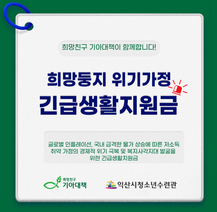 [세계로컬타임즈 조주연 기자] 전북 익산시청소년수련관이 “기아대책 기대플러스 희망둥지 긴급생활지원금 사업에 선정돼 청소년 5명에게 긴급생활비 30만 원씩 지원했다”고 28일 밝혔다.