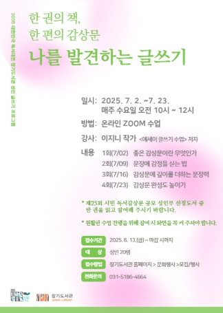 프로그램 참여 신청은 6월 13일(금) 오전 10시부터 장기도서관 홈페이지 ‘문화행사 신청(모집/행사)’ 메뉴를 통해 할 수 있으며, 김포시 성인 20명을 선착순으로 모집한다.