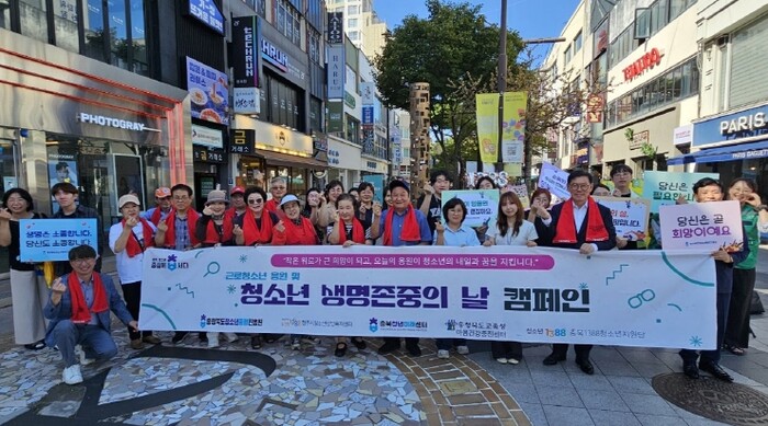 [세계로컬타임즈] 충청북도청소년종합진흥원(원장 김자중)은 9월 10일 세계 자살예방의 날을 맞이해 청주시청소년상담복지센터와 충북청년미래센터, 충청북도교육청 마음건강증진센터, 1388청소년지원단 등 청소년 유관기관과 함께하는 연합 캠페인을 청주 성안길 소나무길 일대에서 진행했다.
