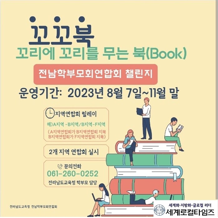 [세계로컬타임즈 김명진 기자] 전남학부모회연합회가 2023년 연합회 특색사업인 ‘꼬꼬북(꼬리에 꼬리를 무는 BOOK) 챌린지’를 8월 7일부터 오는 11월 말까지 22개 지역학부모회연합회와 함께 실시한다.