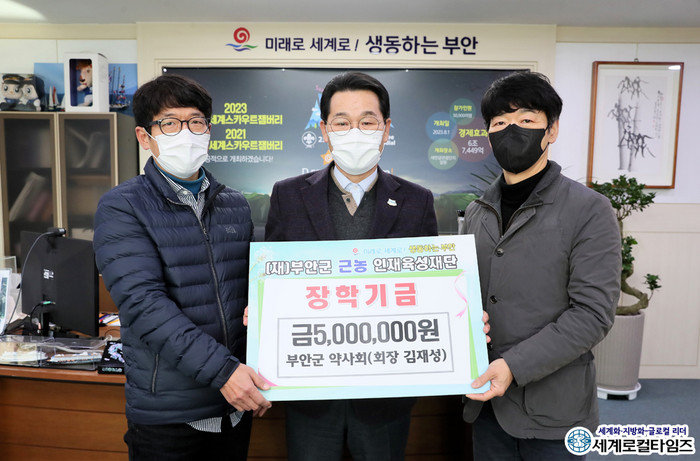 19일 부안군에 따르면 지난 17일 부안군 근농인재육성재단을 방문한 부안군 약사회 김재성 회장은 “부안군 약사회에서도 부안군의 장학사업 발전에 힘을 모으기 위해 회원들의 뜻을 모아 기탁하게 됐다”며 장학금을 전달했다.