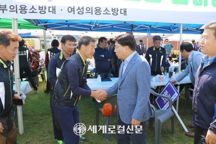 | ▲권선택 대전시장이 의용소방대원에게 악수 나누며 격려하고 있다. <사진= 오영균 기자> |