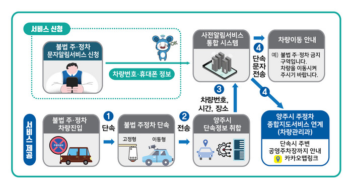 서비스 가입 신청은 양주시청 차량관리과, 가까운 행정복지센터를 방문 등록하거나 양주시 주정차 민원서비스 홈페이지를 통해 신청하면 된다.