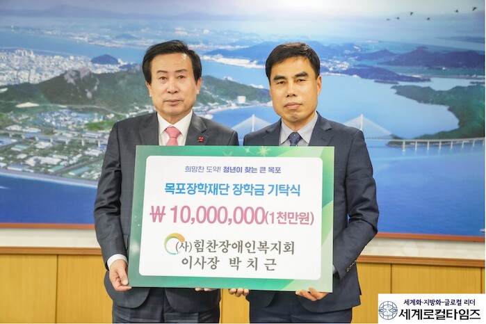 [세계로컬타임즈 김명진 기자] 힘찬장애인복지회가 지난 27일 목포시를 방문해 지역 인재양성을 위한 장학금 1천만원을 목포장학재단(이사장 박홍률 목포시장)에 기탁했다.