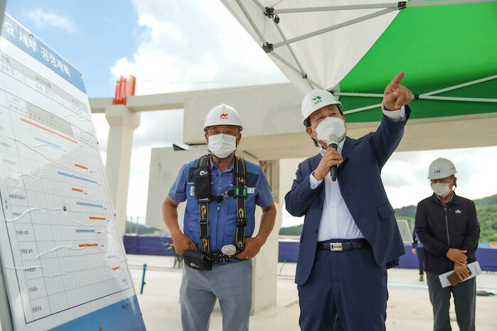 | ▲ 제104회 전국체전 개최 준비를 위해 박홍률 목포시장 종합경기장 건립공사 현장 방문한 모습. (사진=목포시) |