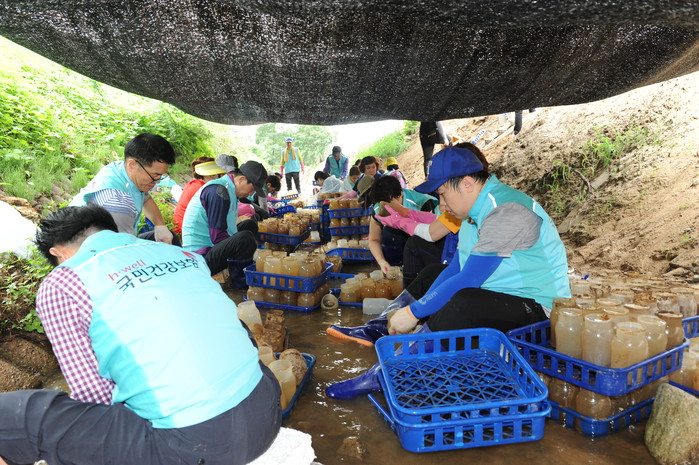 | ▲공단 지역본부, 천안지사 및 아산지사 건이강이봉사단, 양승조 국회의원 등 70여명은 침수 피해를 입은 버섯종균업체의 토사물을 제거하며 종균병을 청소하고 있다. <사진제공=국민건강보험공단> |