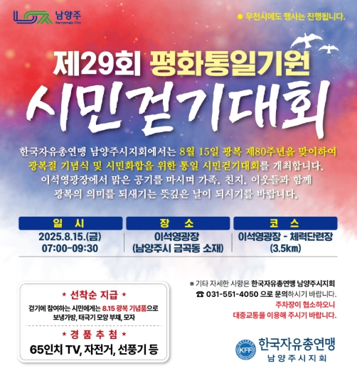 행사는 오전 7시부터 1, 2부로 나눠 진행되며, 1부에서는 광복절 기념식이 열리고 2부에서는 평화통일기원 시민걷기대회가 이어진다. 걷기대회는 홍유릉 주변 산책로 3.5km 코스로 이뤄져 시민 누구나 참여할 수 있다.