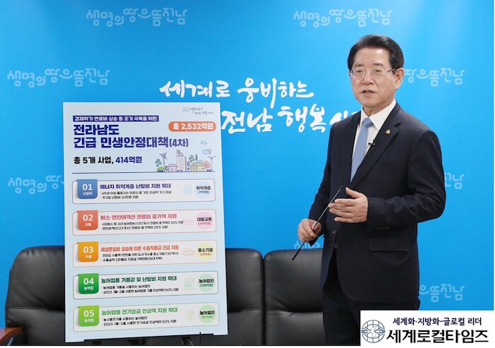 [세계로컬타임즈 김명진 기자] 김영록 전라남도지사는 15일 도청 지방기자실에서 기자간담회를 열어 고물가와 경기침체, 전기세.유류비 상승 등으로 어려운 도민을 위한 긴급 민생안정대책을 발표, 예비비 등 414억 원을 긴급 지원한다고 밝혔다.