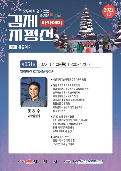 4일 김제시에 따르면 오는 8일, 문경수 과학탐험가가 ’잃어버린 호기심을 찾아서’라는 주제로 김제에서 강연을 진행한다.