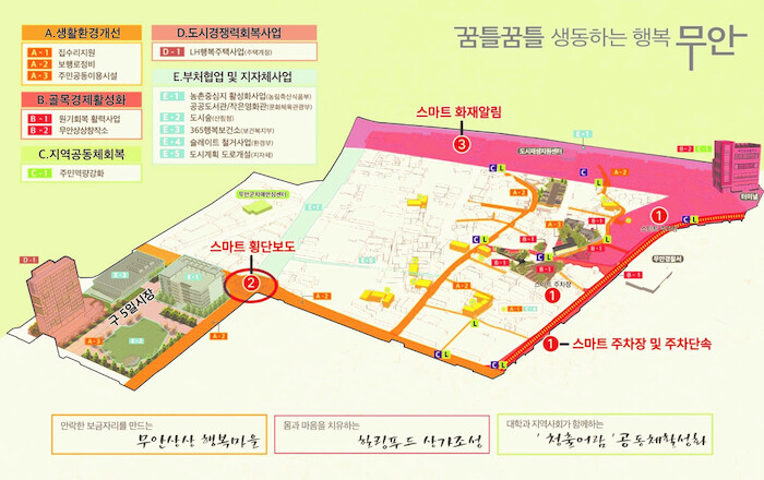 공모에 선정된 무안읍 생활밀착형 도시재생 스마트기술 지원사업은 총 사업비 8억 3400만 원(국비 5억 원)으로 ▲낙지골목 주차타워, 도시재생 주차장에 스마트 주차 서비스와 주차유도 시스템, 낙지특화거리에 불법 주·정차 단속 시스템 ▲무안읍 복합문화센터 앞 도시재생 보행로에 스마트 횡단보도 시스템 ▲중앙로, 낙지골목 일원에 스마트 화재알림 서비스 등을 추진할 계획이다.