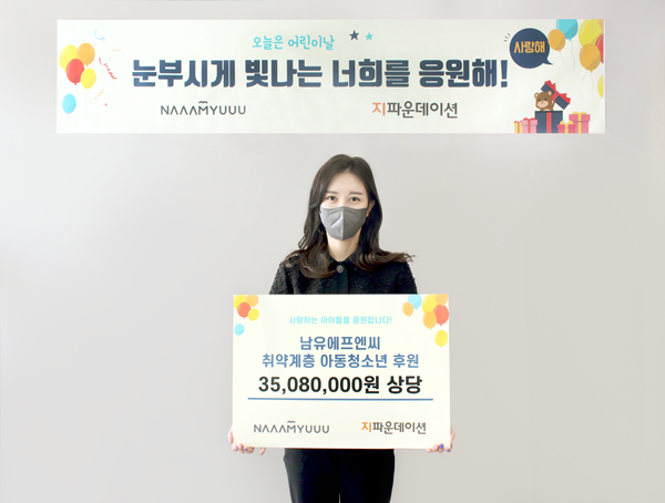 ㈜남유에프엔씨는 돌봄취약계층 아이들이 어린이라면 누구나 축하받고 격려받아야 할 어린이날에 경제적인 사유로 인해 소외되지 않도록 지파운데이션에 후원금을 전달하였다. 지파운데이션은 후원금으로 9개 지역아동센터와 협력해 250명의 아동청소년들에게 케이크 만들기, 테라리움 DIY 등 다양한 활동 지원과 어린이날 선물을 전달할 계획이다.