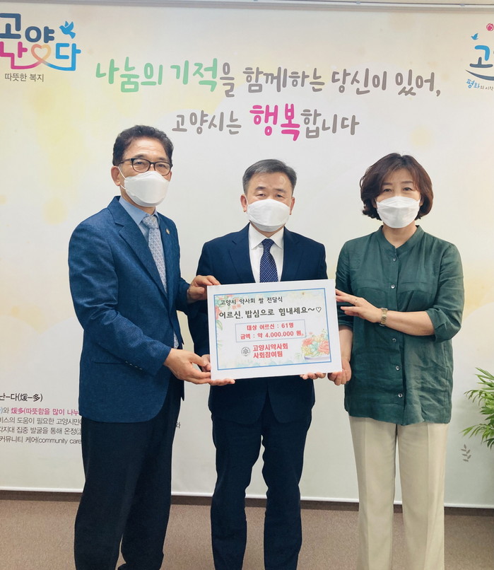 고양시 약사회는 고양시와 2019년 3월 의료사각지대 및 위기가정 발굴·지원을 위한 업무협약(MOU)을 체결해 의료취약계층을 위한 후원을 해왔다. 2020년에도 코로나19 방역 보건의료인, 취약계층 아동을 위해 1,500만 원 상당의 영양제와 성금 500만원을 후원했다.