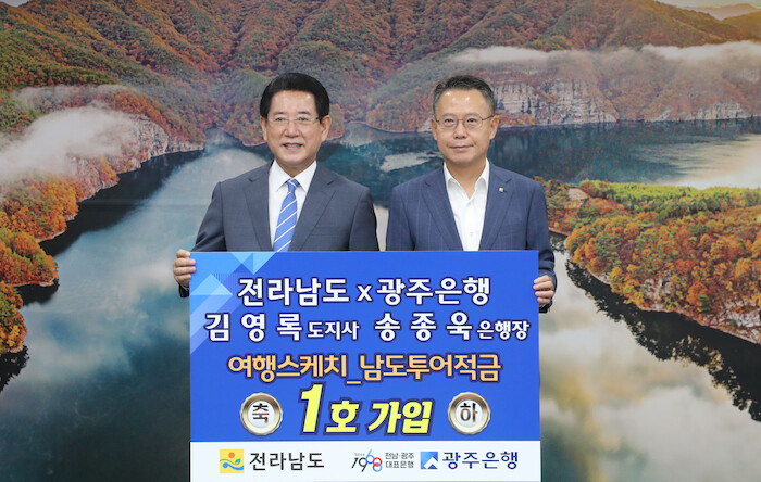 이날 남도투어 우대적금 상품 1호 적금에 가입한 김영록 전남도지사는 “광주은행은 광주‧전남의 향토은행으로 시도민과 함께 발전하는 은행”이라며 “전국 지점을 통해 전남 방문의 해를 적극 홍보해달라”고 당부했다.