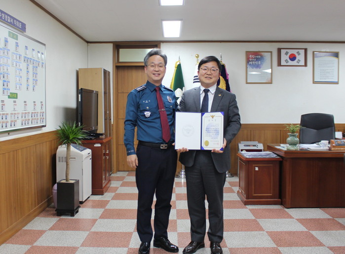 | ▲ 서호영 시의원(오른쪽)은 보이스피싱조직원 검거에 대한 공로로 대구 수성경찰서장으로부터 감사장을 수여받았다.(사진=수성경찰서 제공) |