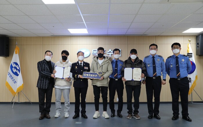 이들은 지난 21일 전북 군산시 어청도 인근 해상에서 침몰하고 있는 화물선을 발견한 뒤 해경에 신고하고 승선원 9명 전원을 구조했다.