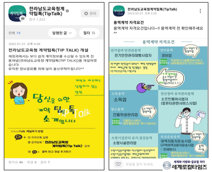 [세계로컬타임즈 김명진 기자] 전라남도교육청이 일선 현장의 계약업무 지원을 위해 ‘계약팁톡(Tip Talk)’ 채널을 운영해 현장의 뜨거운 반응을 얻고 있다.