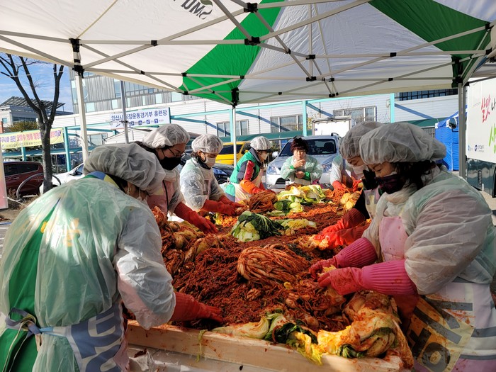 | ▲ 안산시새마을회 자원봉사자들이 김치봉사를 하고 있다.(사진=안산시) |
