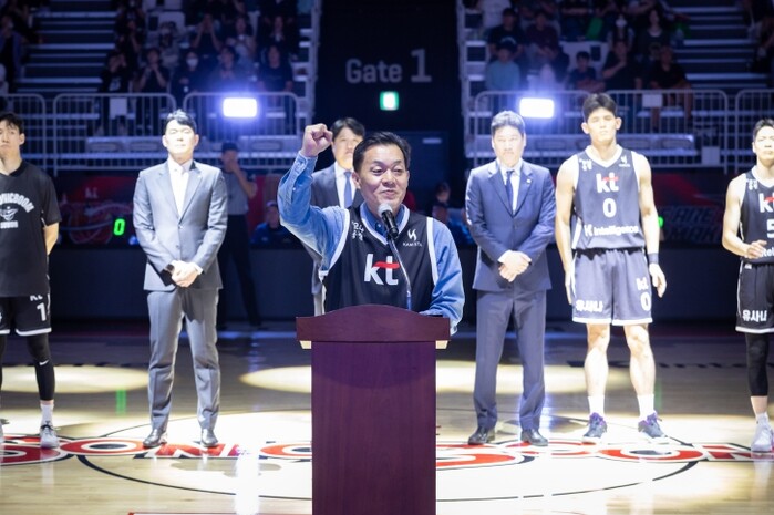 수원KT소닉붐과 부산KCC의 홈 개막전에서 축사를 한 이재준 시장은 “시민과 함께 수원KT 소닉붐의 우승을 기원하며 시민들과 함께 응원하겠다”고 말했다. 이재준 시장은 개막선언을 했다.