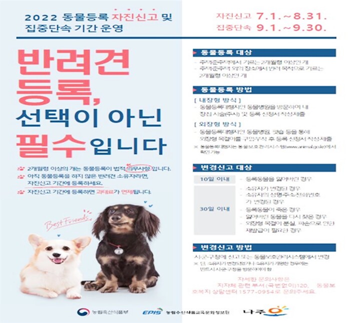 나주시(시장 윤병태)는 오는 8월 31일까지 반려동물 미등록·변경사항 및 자진신고 등록 기간을 운영한다고 8일 밝혔다.지난 2014년부터 시행 중인 반려동물 등록제에 따라 주택·준주택 또는 이외 공간에서 반려목적으로 기르는 2개월 이상 개는 의무 등록해야 한다.