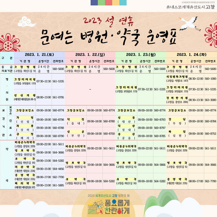 설 연휴기간 중 진료가능한 병·의원과 약국에 관한 자세한 정보는 고창군 보건소 홈페이지에서 확인 가능하며 보건복지상담센터, 119구급상황관리센터, 응급의료포털 사이트 또는 스마트폰 앱 응급의료정보제공을 통해서도 안내받을 수 있다.