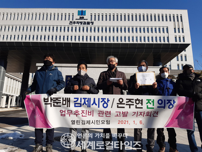 6일 ‘열린김제시민모임’(이하 시민모임)은 전주지방검찰청 앞에서 기자회견을 열고 “업무상 횡령 혐의 등으로 고발하오니 철저한 수사를 통해 밝혀 달라”며 “고발장을 접수했다”고 밝혔다.