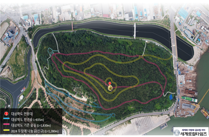 현재 시민들이 많이 찾는 대삼학도 둘레길 1.2km는 ‘황토 맨발길’로 재조성되고 정상까지 무장애길 1.8km를 신규 노선으로 구상해 나간다는 복안이다.