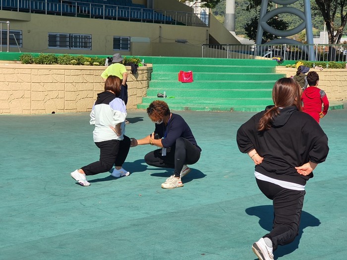 | ▲공설운동장에서 전문운동강사가 참여자들에게 스트레칭 및 근력운동을 지도하고 있다.(사진=화순군) |