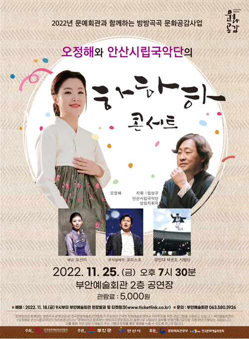 16일 부안군에 따르면 ‘오정해와 안산시립국악단의 하하하콘서트’가 오는 25일 오후 7시 30분에 부안예술회관 무대에 오른다.