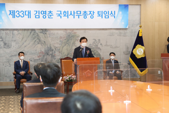 | ▲ 제33대 김영춘 국회사무총장이 퇴임식 인사말을 하고 있다.(사진=국회 제공) |
