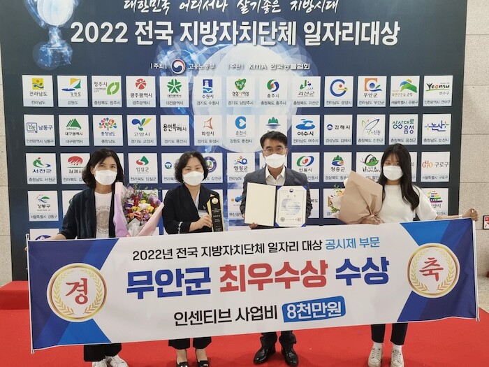 [세계로컬타임즈 박종현 기자] 무안군(군수 김산)은 지난 21일 세종 컨벤션센터에서 열린 고용노동부 주관 2022년 전국 지방자치단체 일자리대상 시상식에서 일자리 공시제 부문 최우수상을 수상했다고 밝혔다.